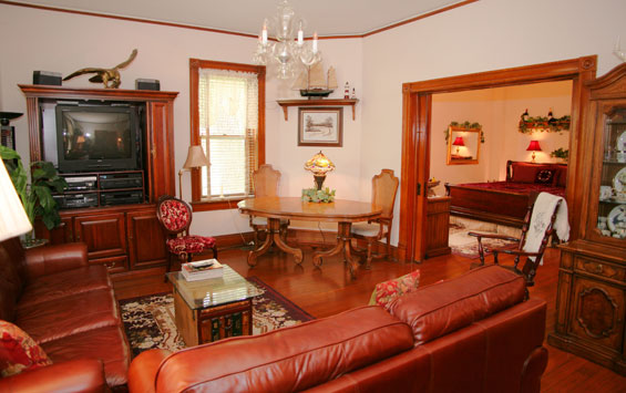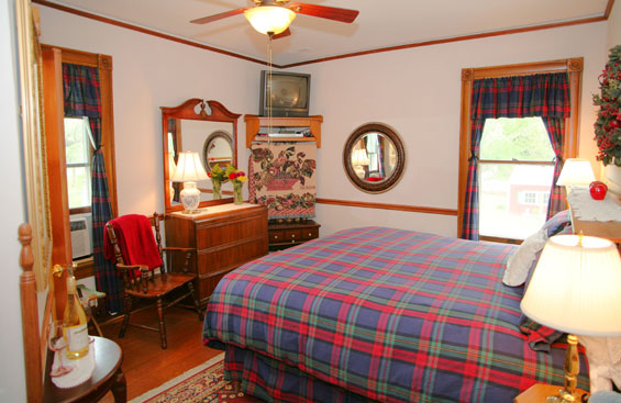 This popular Duke and Duchess Suite has TWO spacious rooms on ground level with five windows. The large living room has a leather sofa, love seat, large TV, refrigerator, and table. The bedroom has a king bed, private updated bath/shower, 32" flat screen TV and DVDs, and luxury linens fit for royalty. On occasion the suite can accommodate four or five by adding two extra beds. $29 for each extra person is charged.